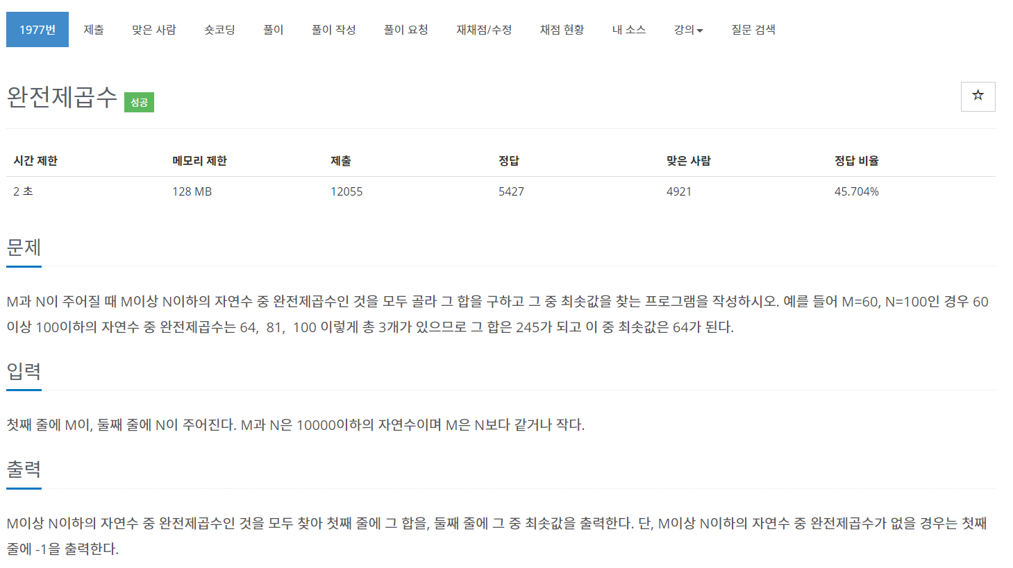 이번에는 BOJ의 1977번 문제 "완전제곱수" 를 풀어보도록 하자