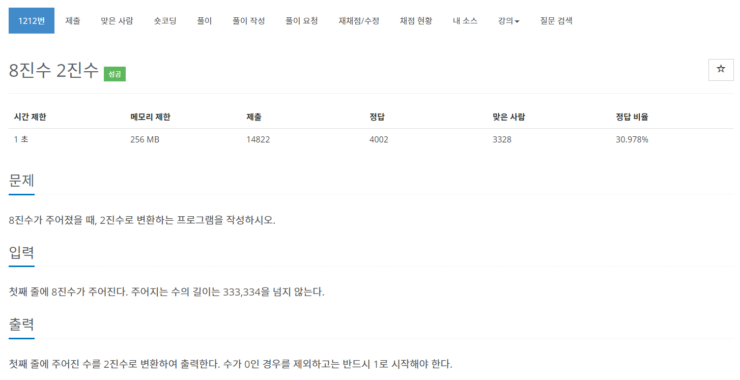 이번에는 BOJ의 1212번 문제 "8진수 2진수" 를 풀어보도록 하자