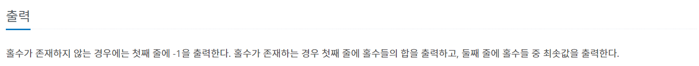 홀수가 존재하지 않는 경우에는 첫째 줄에 -1을, 홀수가 존재하는 경우 첫째 줄에 홀수들의 합을 출력하고, 둘째 줄에 홀수들 중 최솟값을 출력하면 되는 문제이다.