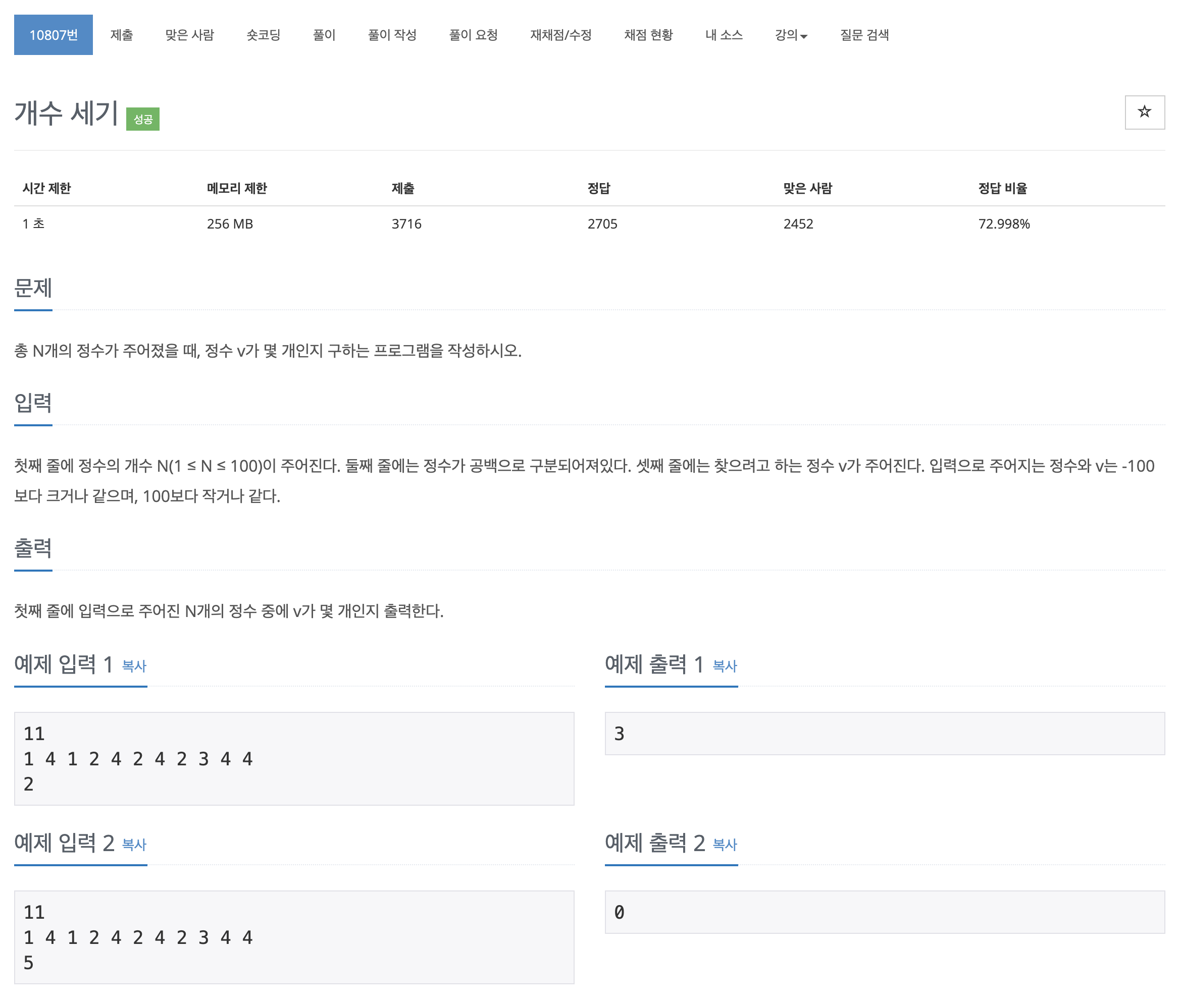 이번에는 BOJ의 10807번 문제 "개수 세기" 를 풀어보도록 하자
