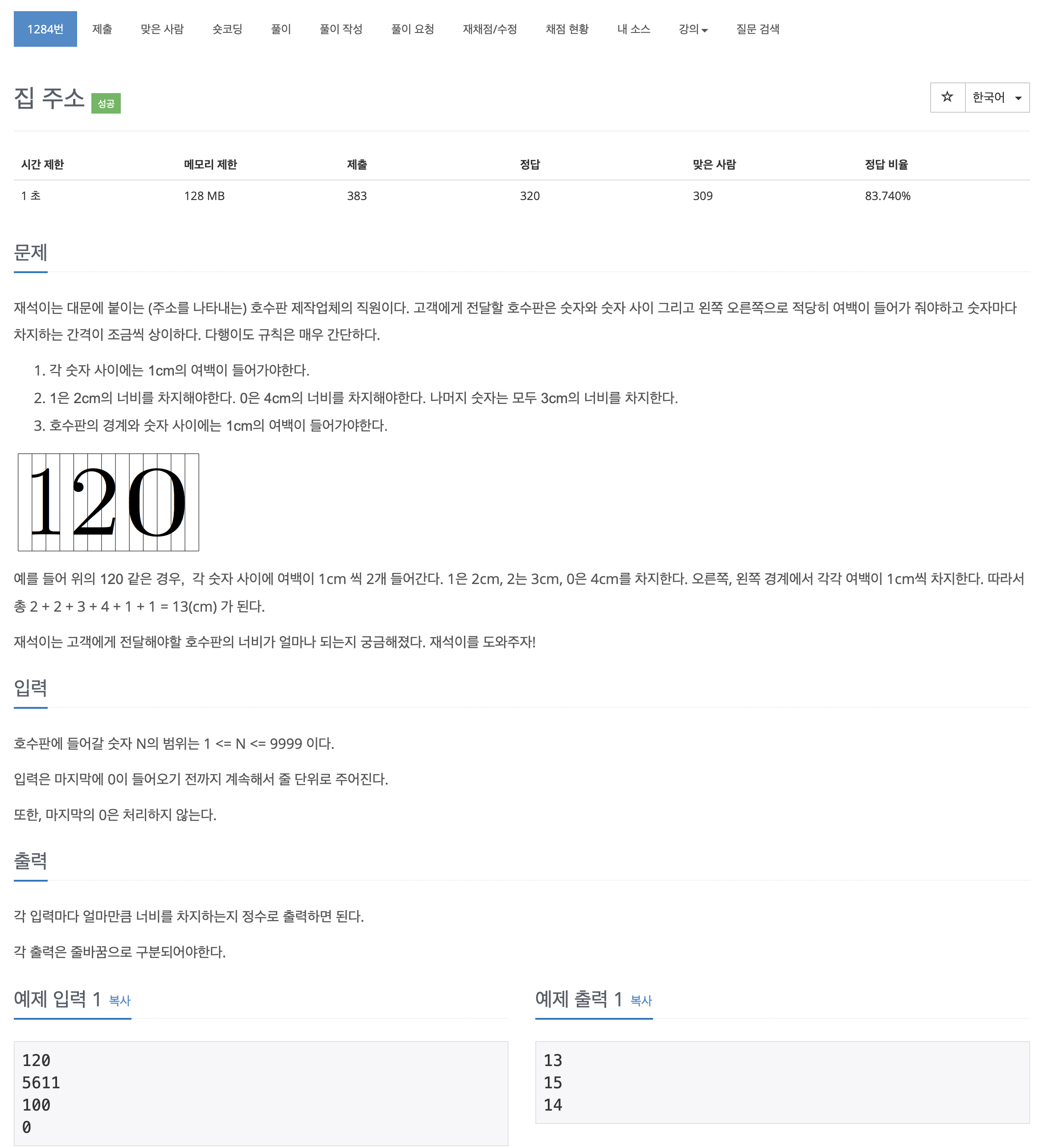 이번에는 BOJ의 1284번 문제 "집 주소" 를 풀어보도록 하자