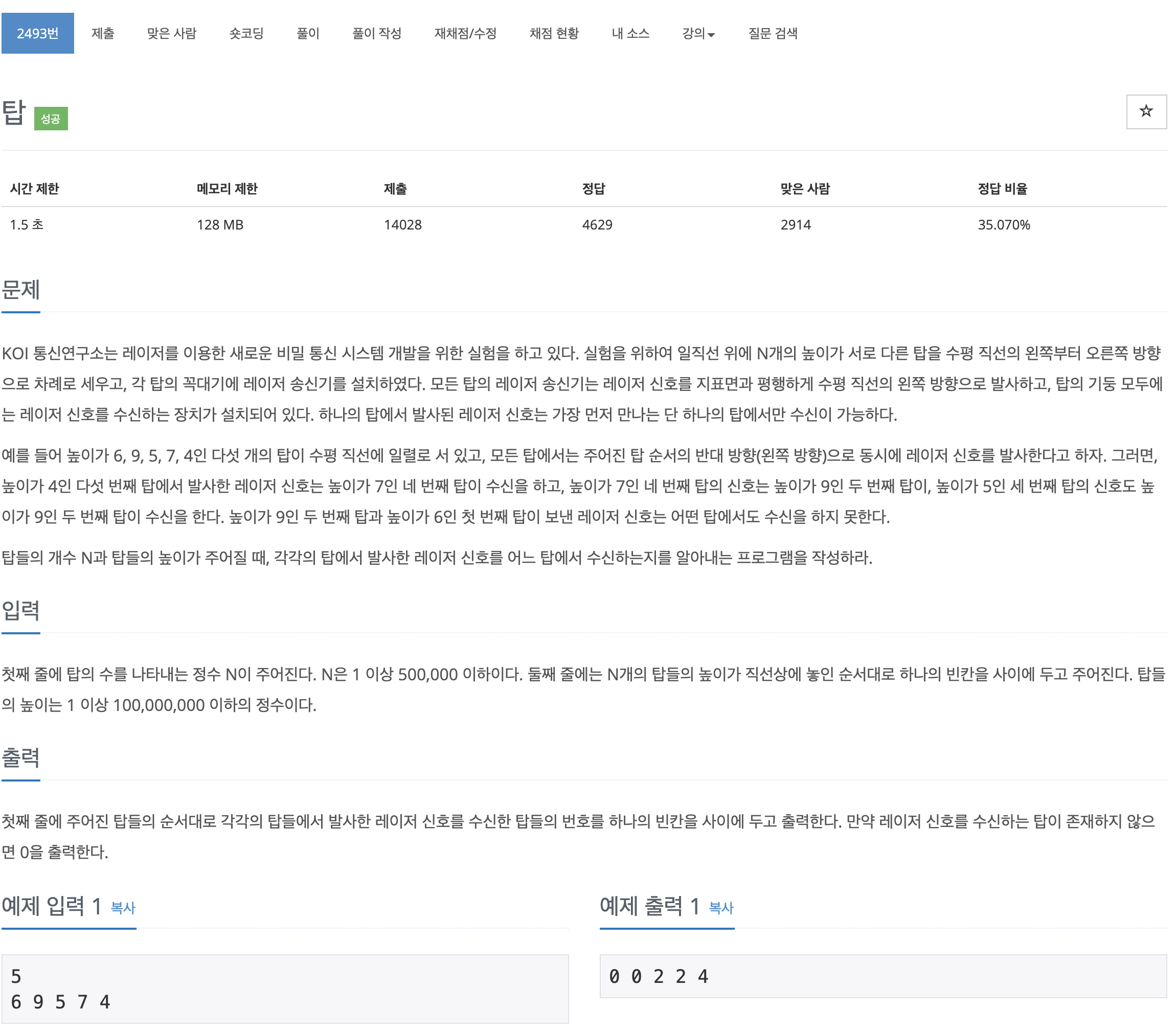이번에는 BOJ의 2493번 문제 "탑" 을 풀어보도록 하자