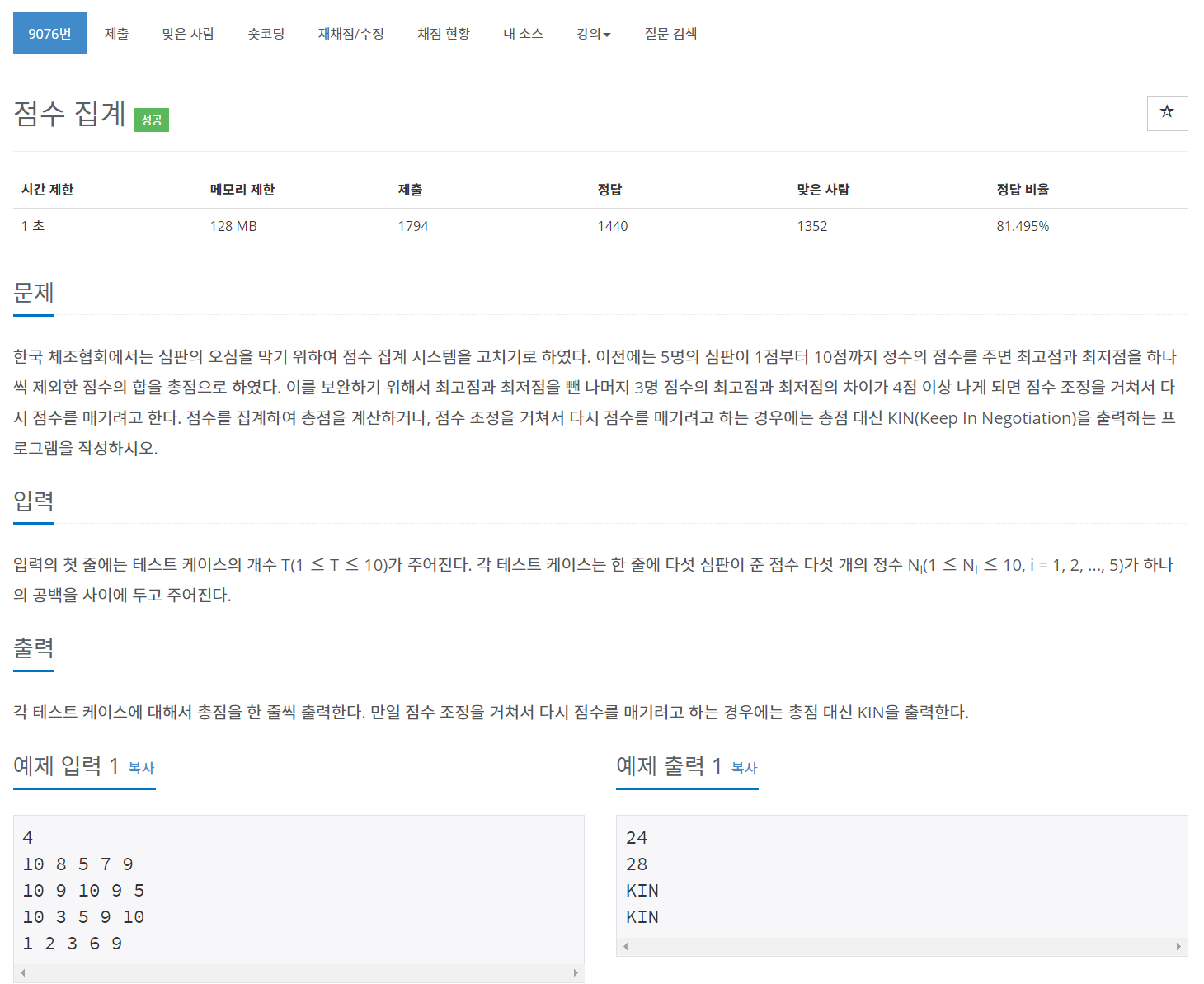이번에는 BOJ의 9076번 문제 "점수 집계" 를 풀어보도록 하자