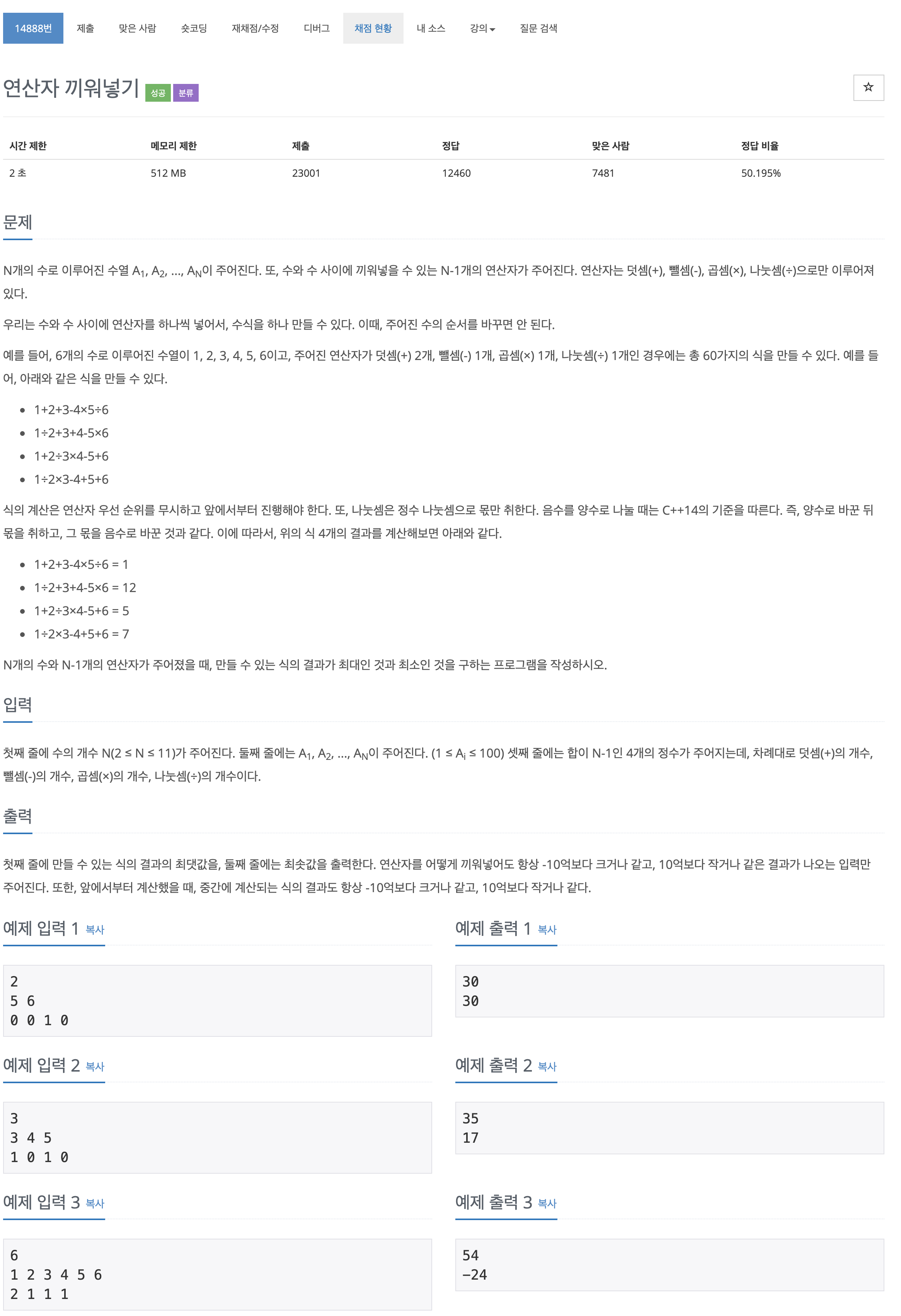 이번에는 BOJ의 14888번 문제 "연산자 끼워넣기" 를 풀어보도록 하자