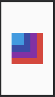 아래는 가로세로 80dp 인 빠알간색, 보라색, 남색, 하늘색 뷰를 만들고 부모에 gravity 를 center_horizontal 로 설정해 줬어. 그리고 빨간색 뷰에 android:layout_alignParentTop="true" 를 설정했고 나머지 뷰들에는 바로위에 있는 뷰의 밑에 올 수 있게끔, below 속성을"@+id/{바로 위에있는 자식 뷰}" 와 같이 설정해 줬어.
