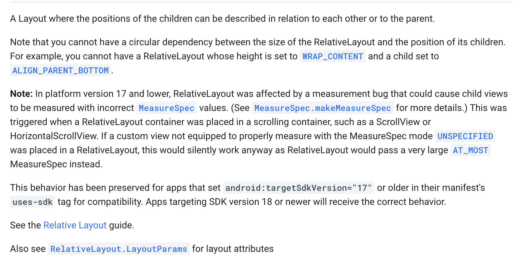 간단히 내용만 추려보자면 API 17 이하에서 스크롤 안에있는 RelativeLayout 의 경우 자식뷰들이 틀린 MesureSpec 값을 갖게 되는 버그가 있다는데..