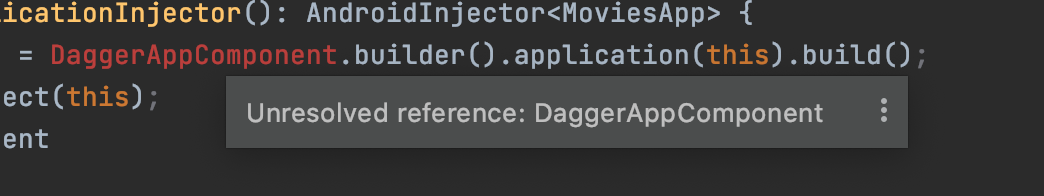 오늘은 Kotlin 으로 Dagger2 사용하다가 DaggerApplicationComponent 가 아래와 같이 찾을 수 없다고 떴을 때,