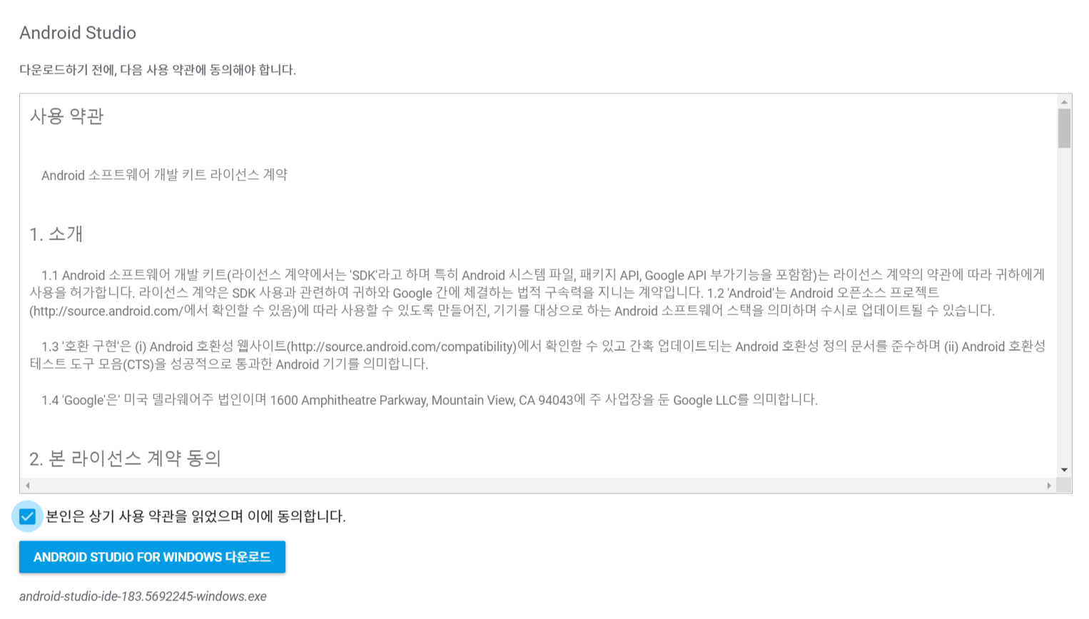 누르면, 밑에 첨부한 것과 같이 사용약관이 나오게 되고, 하단에 있는 "본인은 상기 사용 약관을 읽었으며 이에 동의합니다"를 체크하고 Android Studio 를 다운 받으시면 됩니다.