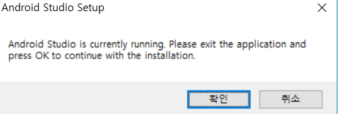 아래와 같은 오류가 뜨네요... Android Studio 를 실행시키고 있어서 그것을 끄고 다시 실행해 달라네요. 지금 하고 있는게 있어서 이 단계는 건너 뛸게요. 죄송합니다 ㅠㅠ
