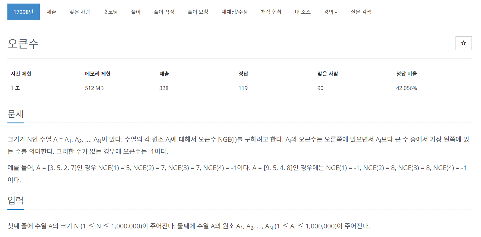 이번엔는 BOJ의 17298번 오큰수를 풀어보도록 하자