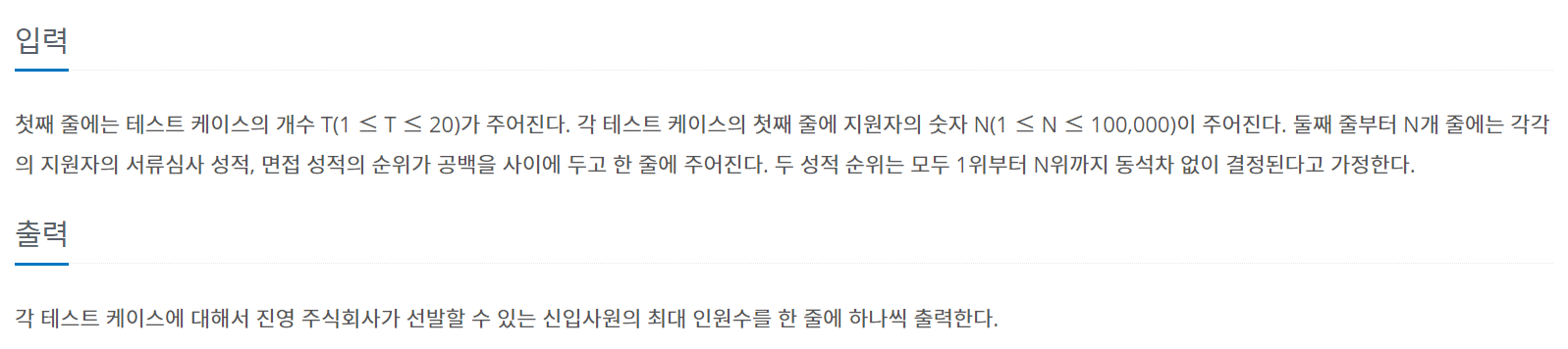 먼저 테스트 케이스 T가 주어지고 각 테스트 케이스마다 면접을 본 지원자의 수 N이 주어진다. 그 다음줄 부터 지원자들의 서류심사와 면접시험의 결과가 등수로 나오게 되는데, 그 등수를 이용해서 뽑힐 수 있는 신입사원의 최대 인원 수를 구하는 프로그램을 작성하면 된다.