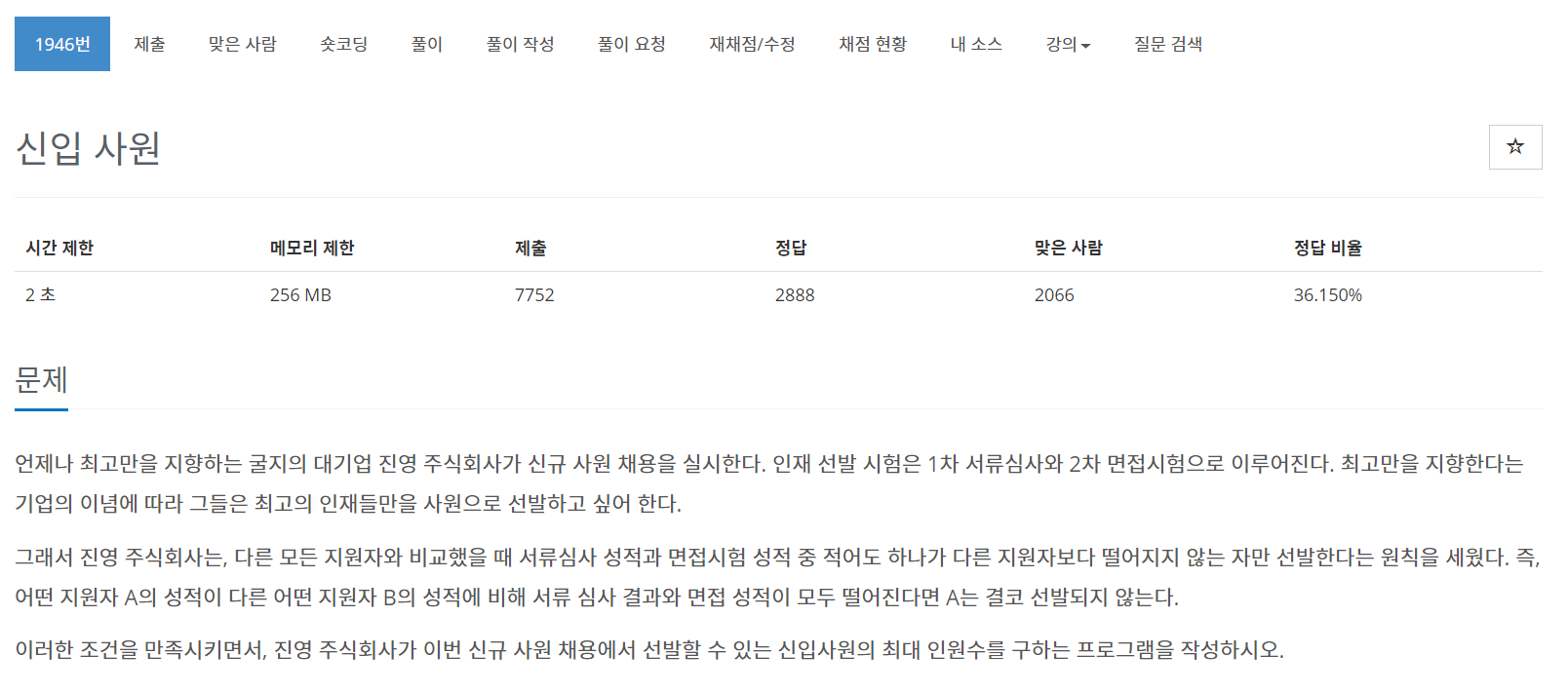 이번에는 백준알고리즘 1946번 신입사원 문제를 풀어보도록 하자
