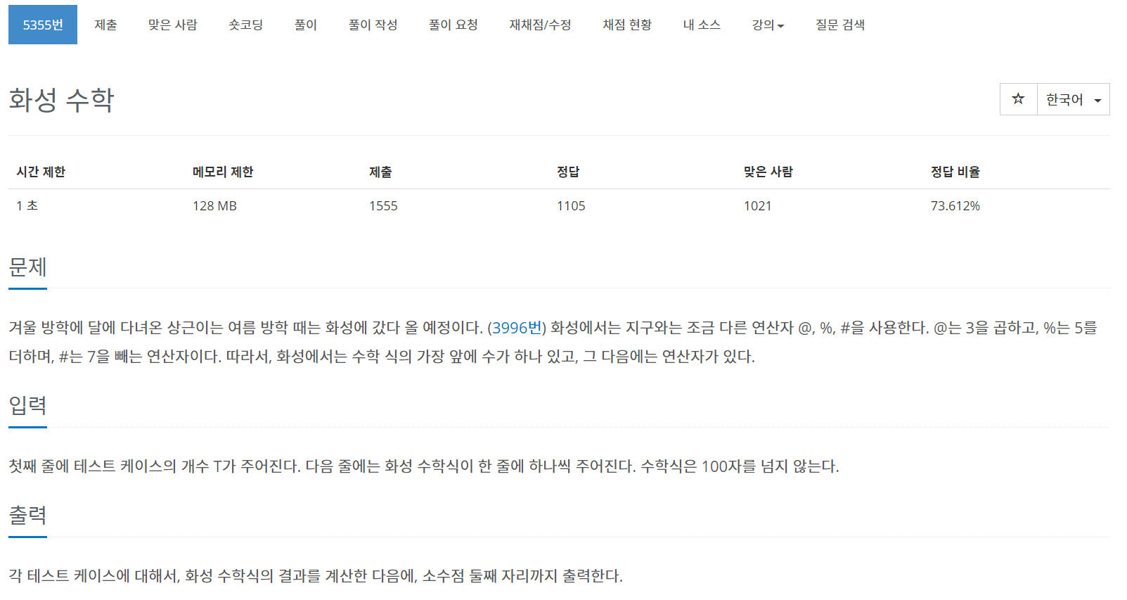 문제 겨울 방학에 달에 다녀온 상근이는 여름 방학 때는 화성에 갔다 올 예정이다. (3996번) 화성에서는 지구와는 조금 다른 연산자 @, %, #을 사용한다. @는 3을 곱하고, %는 5를 더하며, #는 7을 빼는 연산자이다. 따라서, 화성에서는 수학 식의 가장 앞에 수가 하나 있고, 그 다음에는 연산자가 있다. 입력 첫째 줄에 테스트 케이스의 개수 T가 주어진다. 다음 줄에는 화성 수학식이 한 줄에 하나씩 주어진다. 수학식은 100자를 넘지 않는다.