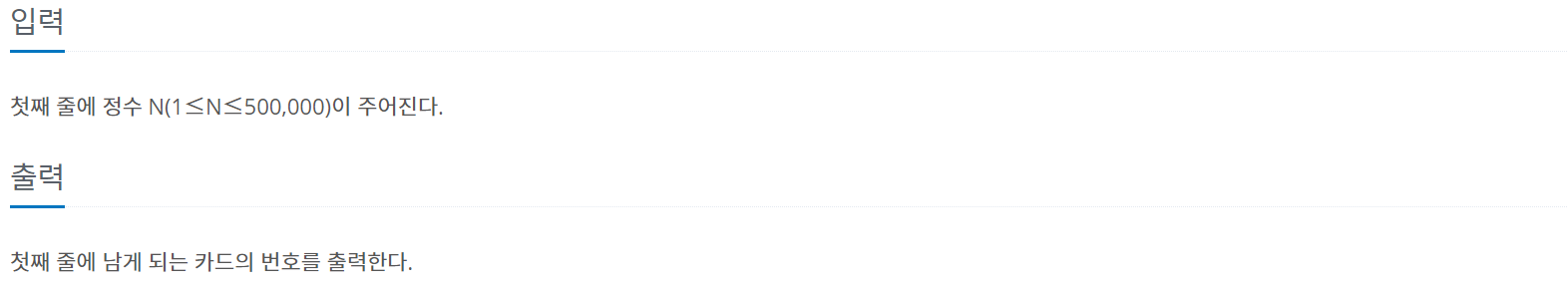 N장의 카드가 있다. 각각의 카드는 차례로 1부터 N까지의 번호가 붙어 있으며, 1번 카드가 제일 위에, N번 카드가 제일 아래인 상태로 순서대로 카드가 놓여 있다. 이제 다음과 같은 동작을 카드가 한 장 남을 때까지 반복하게 된다. 우선, 제일 위에 있는 카드를 바닥에 버린다. 그 다음, 제일 위에 있는 카드를 제일 아래에 있는 카드 밑으로 옮긴다. 예를 들어 N=4인 경우를 생각해 보자. 카드는 제일 위에서부터 1234 의 순서로 놓여있다. 1을 버리