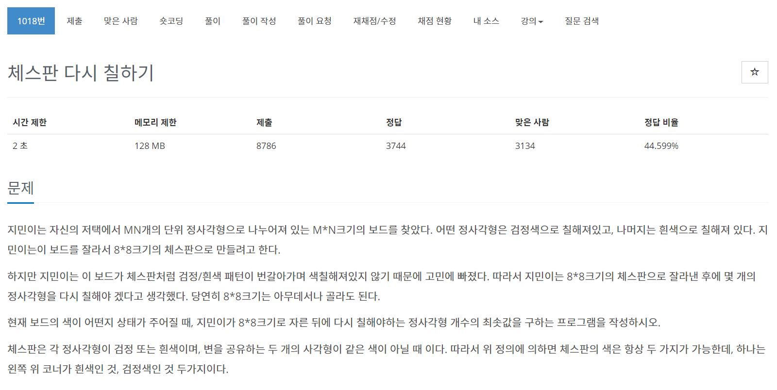 이번에는 BOJ의 1018번 문제 "체스판 다시 칠하기"를 풀어보도록 하자