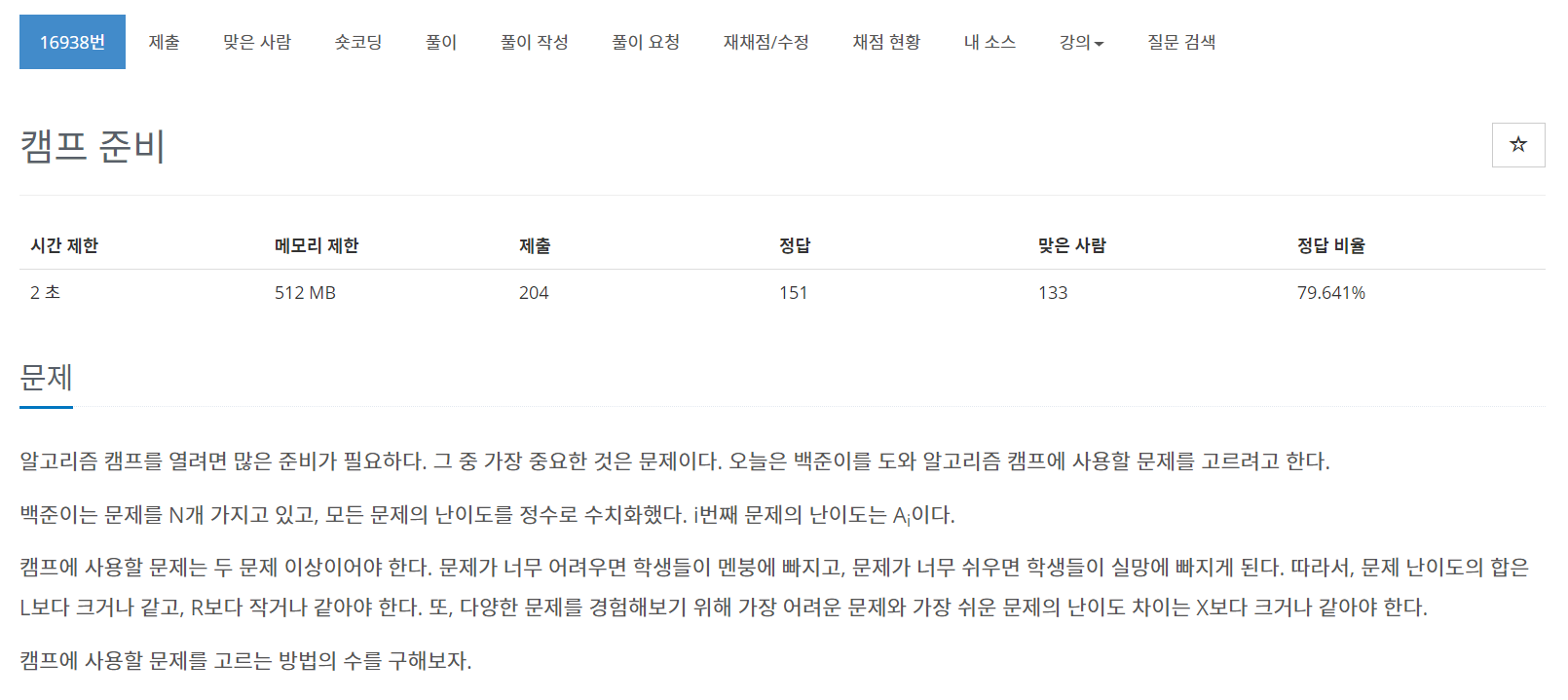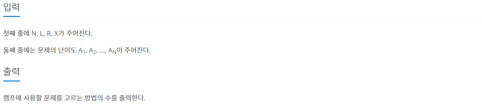 이번에는 BOJ의 16938번 문제 "캠프 준비"를 풀어보도록 하자