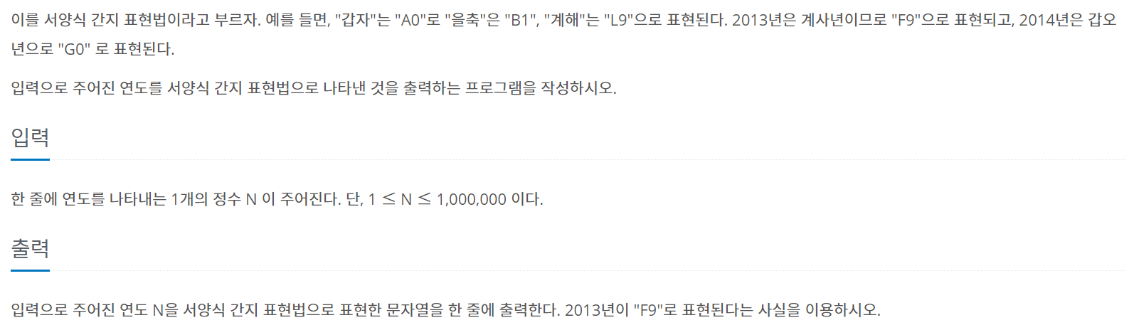 입력으로 연도가 주어지고 해당연도의 간지를 간지롭게 구하면 되는 문제이다. 일단, 문제 에서 주어지는 2013년은 "F9", 2014년은 "G0" 등을 이용해서 문제를 풀어도되고, 1984년이 갑자년"A0" 이라는 사실을 알고 있기 때문에, 이를 이용해서 문제를 풀었다.
