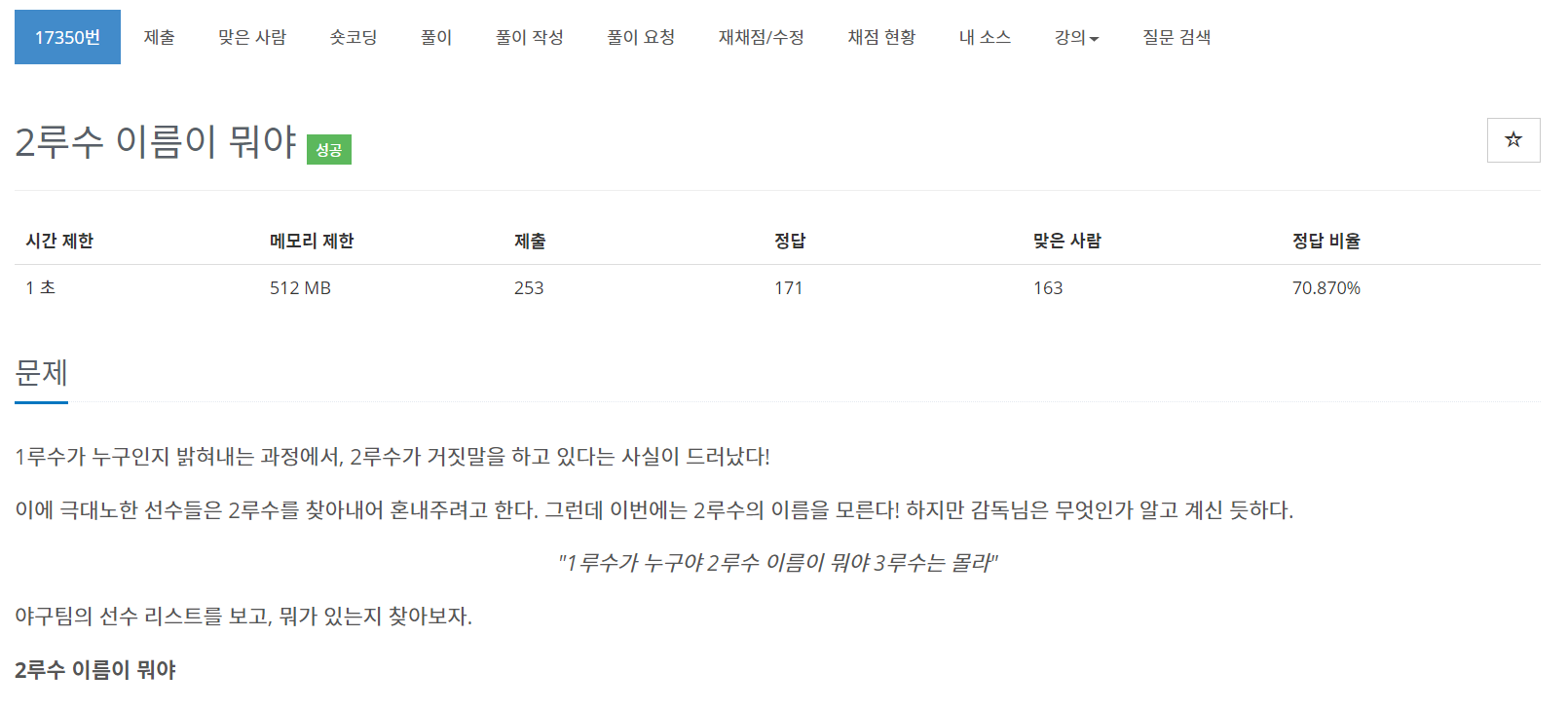 이번에는 BOJ의 17350번 문제 "2루수 이름이 뭐야"를 풀어보도록 하자