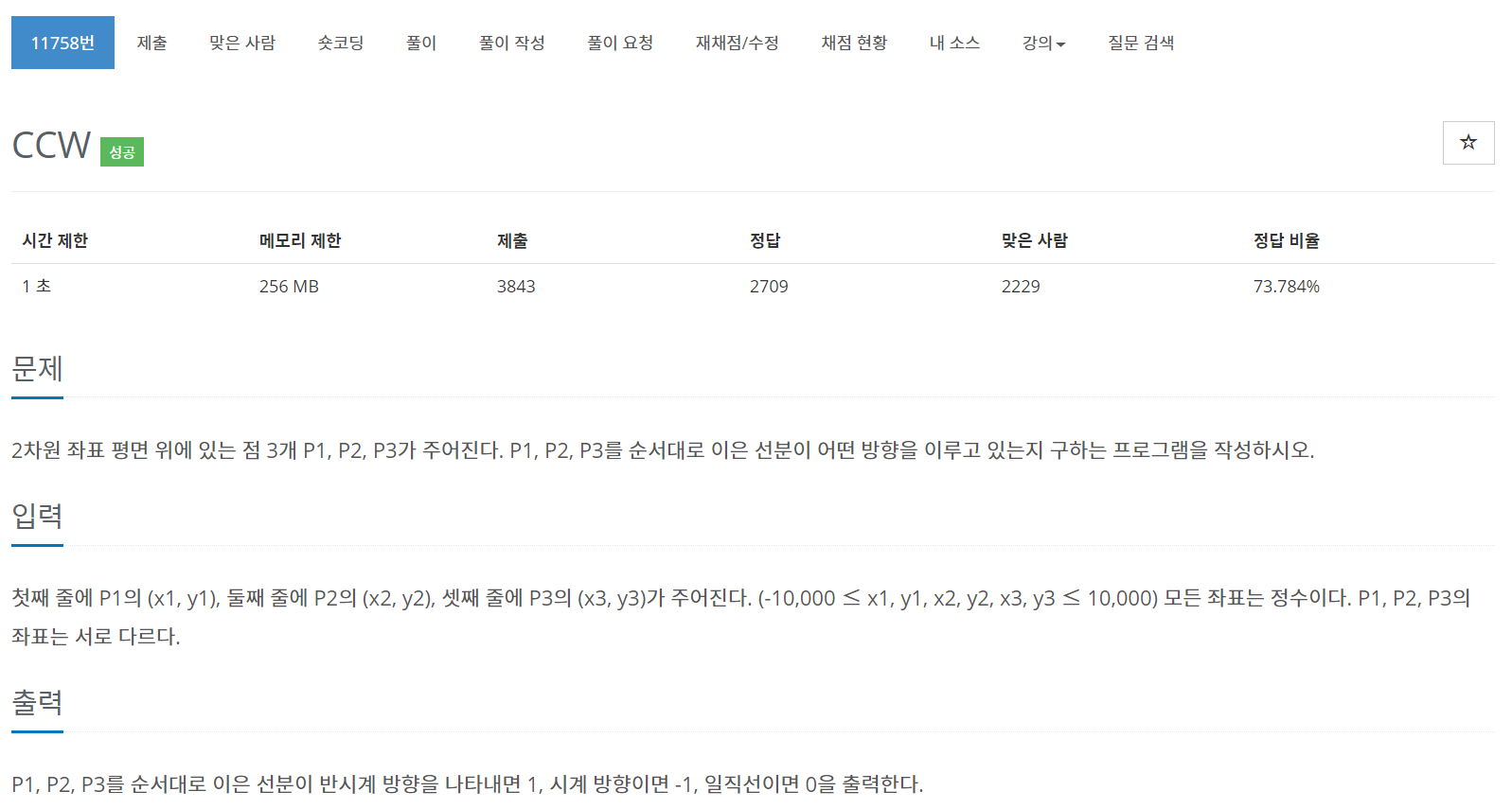 이번에는 BOJ의 11758번 문제 "CCW"를 풀어보도록 하자.