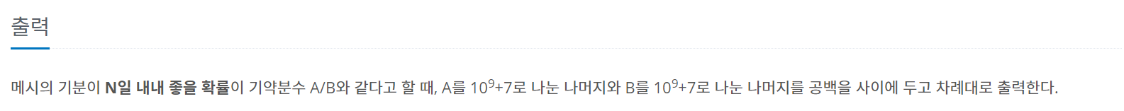 메시의 기분이 N일 내내 좋을 확률이 기약분수 A/B와 같다고 할 때, A를 109+7로 나눈 나머지와 B를 109+7로 나눈 나머지를 공백을 사이에 두고 차례대로 출력한다.