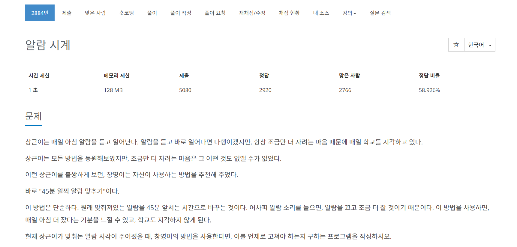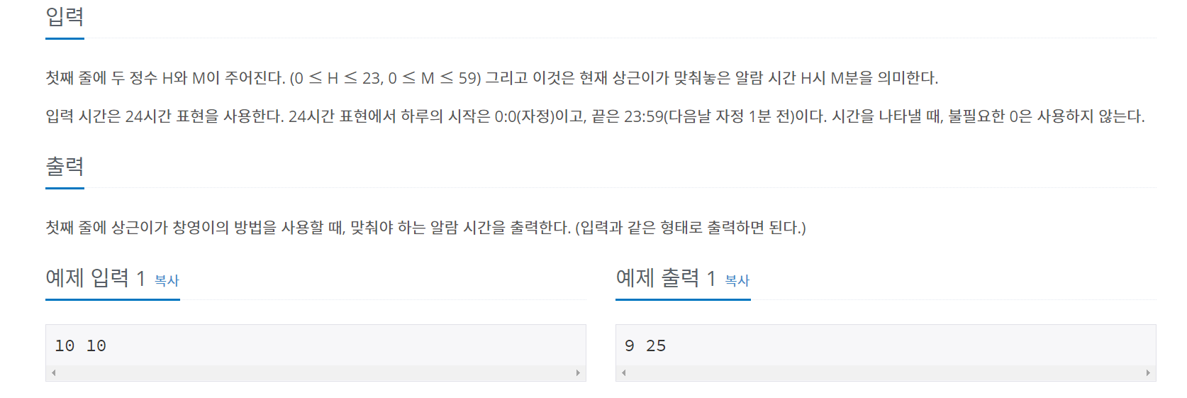 오늘은 백준알고리즘의 2884번 문제 (알람시계) 를 풀어보도록 하자
