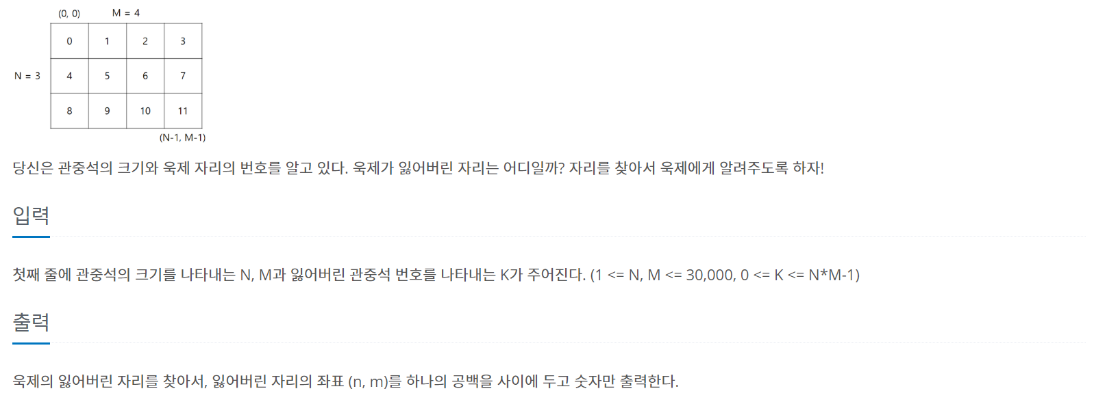 첫째 줄에 관중석의 크기를 나타내는 N, M과 잃어버린 관중석 번호를 나타내는 K가 주어진다. (1 <= N, M <= 30,000, 0 <= K <= N*M-1)