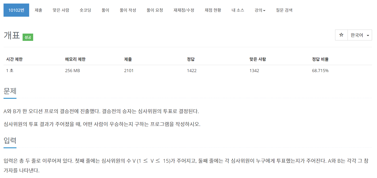 이번에는 BOJ의 10102번 문제 "개표"를 풀어보도록 하자