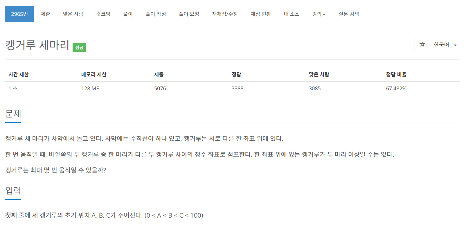 이번에는 BOJ의 2965번 문제 "캥거루 세마리"를 풀어보도록 하자