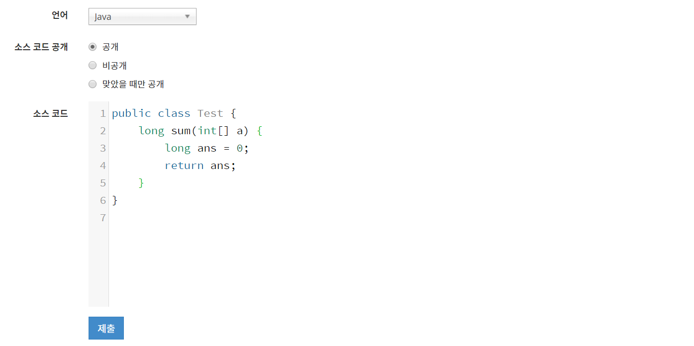 public class Test { long sum(int[] a) { long ans = 0; for(int i = 0; i < a.length; i++){ ans += a[i]; } return ans; } }간단데쇼