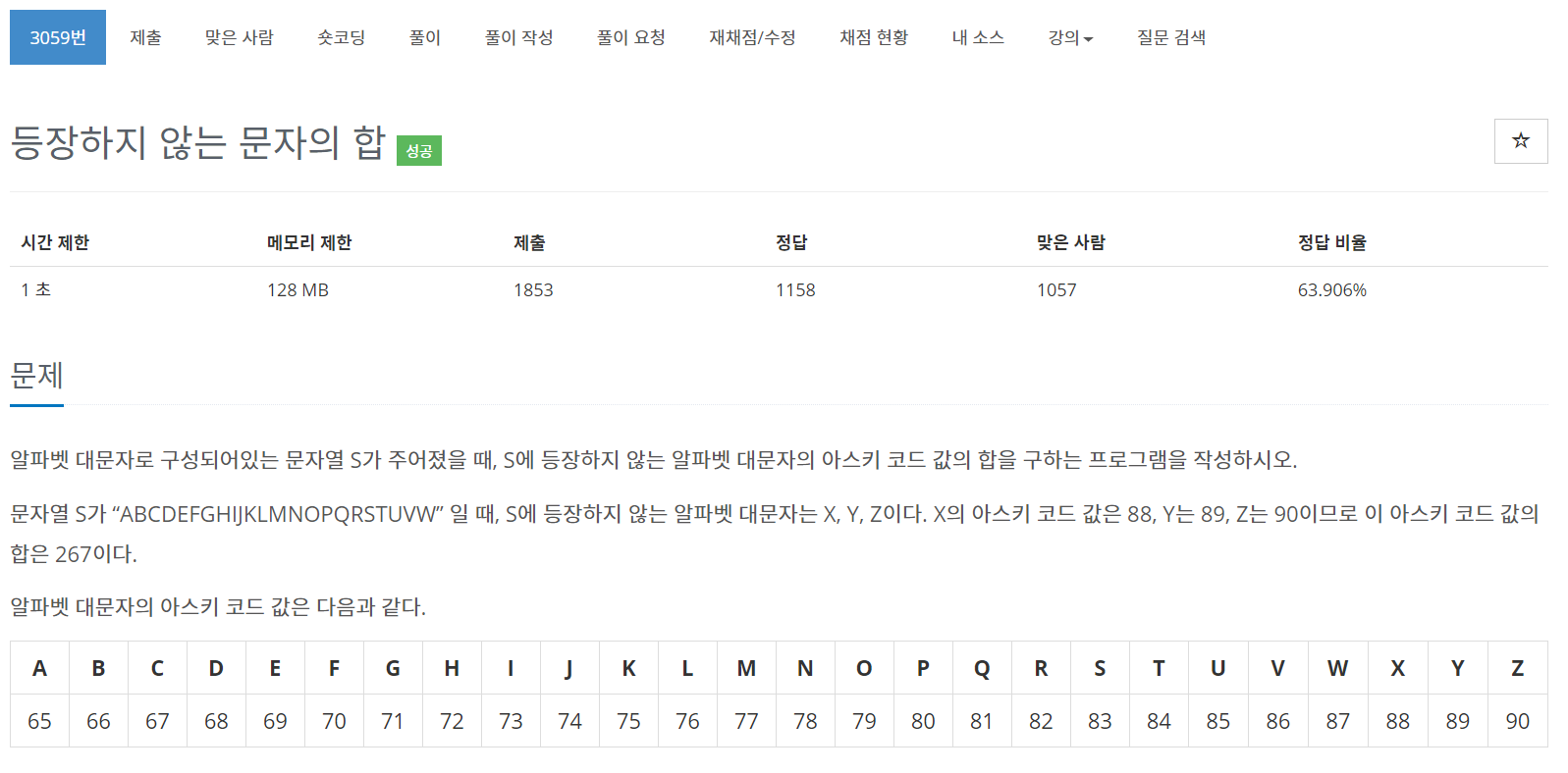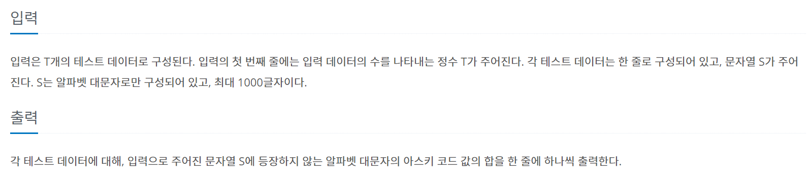 이번에는 BOJ의 3059번 문제 "등장하지 않는 문자의 합" 을 풀어보도록 하자