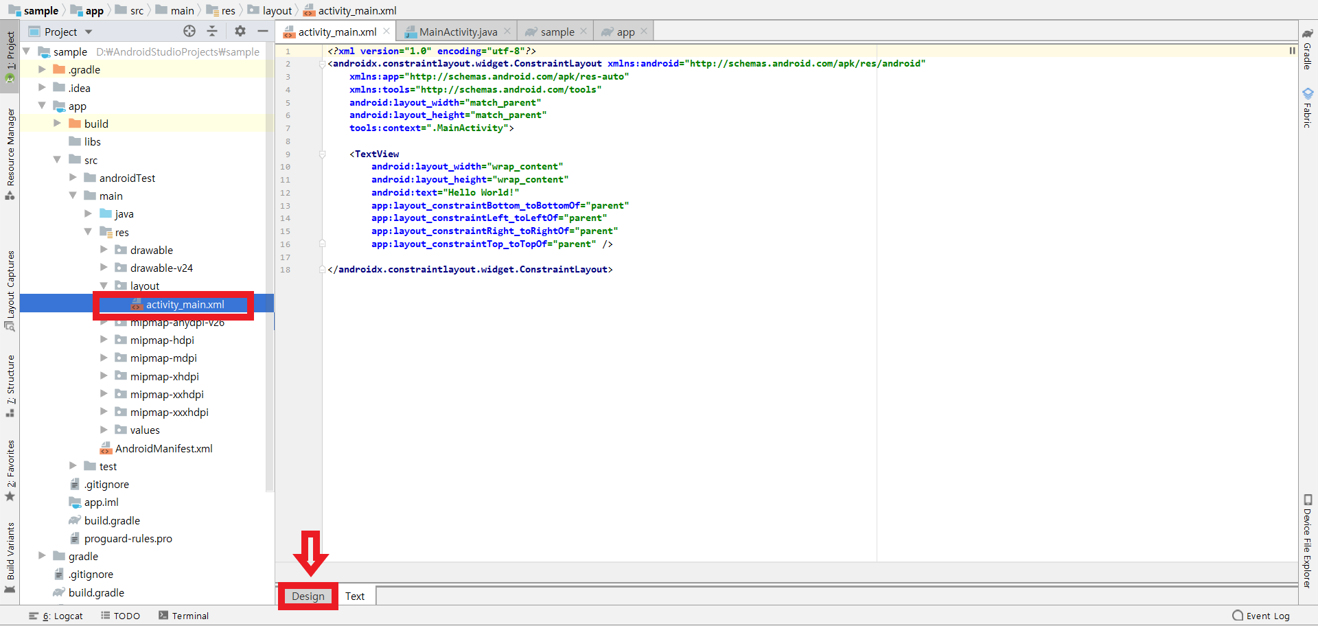 그리고, Design탭옆에 있는 Text탭을 선택해주면, xml파일의 소스코드가 보이게 되는데, 방금 변경한 부분들이 적용된 것을 알 수 있습니다.