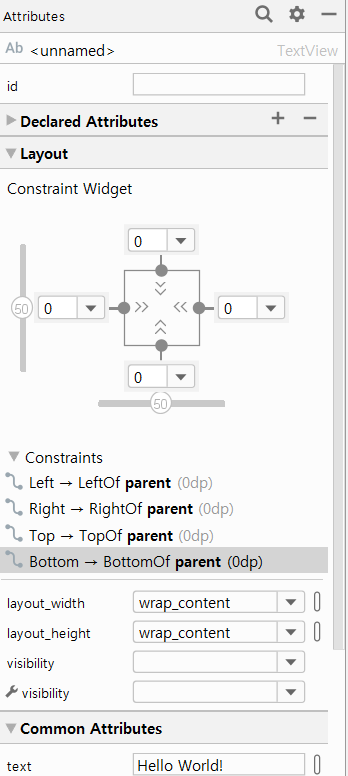 해당 뷰 id를 constrain_layout1로 지정해 주면, ConstrainㅅLayout이 constraint_layout1 으로 변경 된 것을 확인할 수 있습니다. 그리고 TextView를 보게 되면 "Hello World!" 라고 되어있는데, 이것은 TextView의 텍스트가 "Hello World!"라고 되어 있다는 뜻입니다.