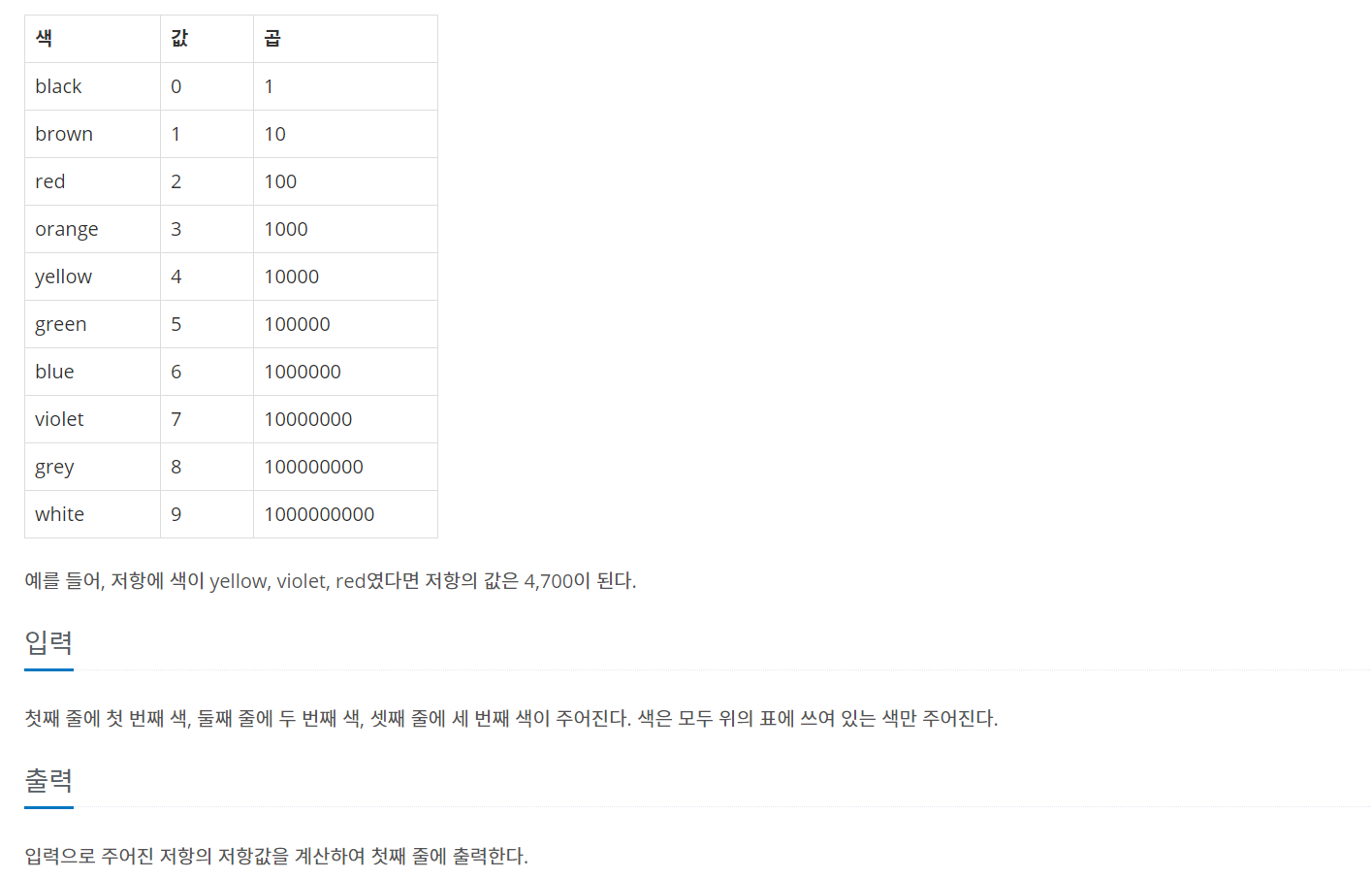 이번에는 BOJ의 1076번 문제 "저항" 을 풀어보도록 하자