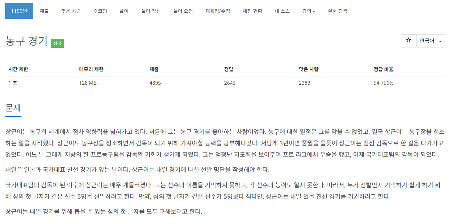 이번에는 BOJ의 1159번 문제 "농구 경기" 을 풀어보도록 하자