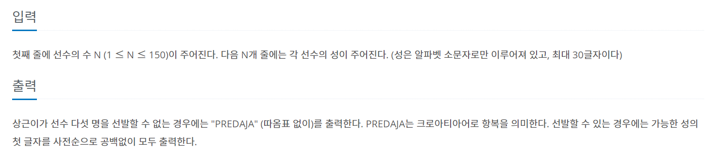 출력으로는 다섯명의 선수를 선발할 수 없을 경우 "PREDAJA"를, 선발할 수 있을 경우 가능한 선의 첫 글자를 사전순으로 공백없이 출력하면 된다.