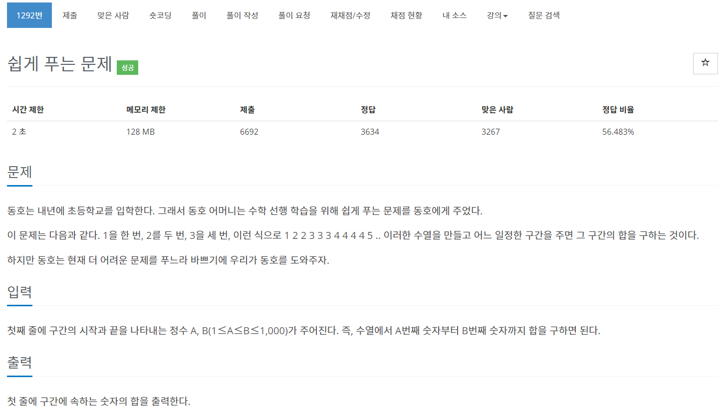 이번에는 BOJ의 1292번 문제 "쉽게 푸는 문제" 를 풀어보도록 하자
