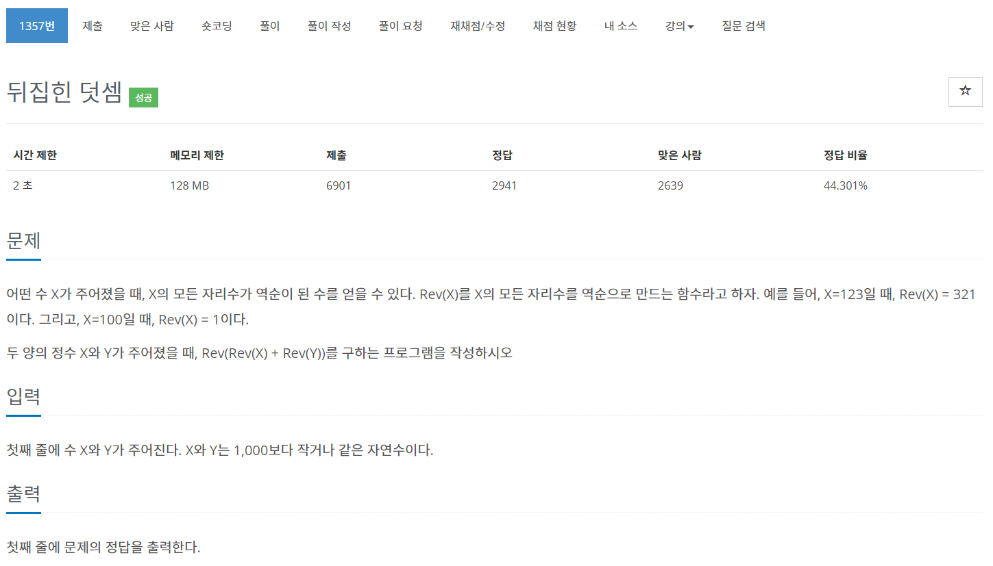 이번에는 BOJ의 1357번 문제 "뒤집힌 덧셈" 을 풀어보도록 하자