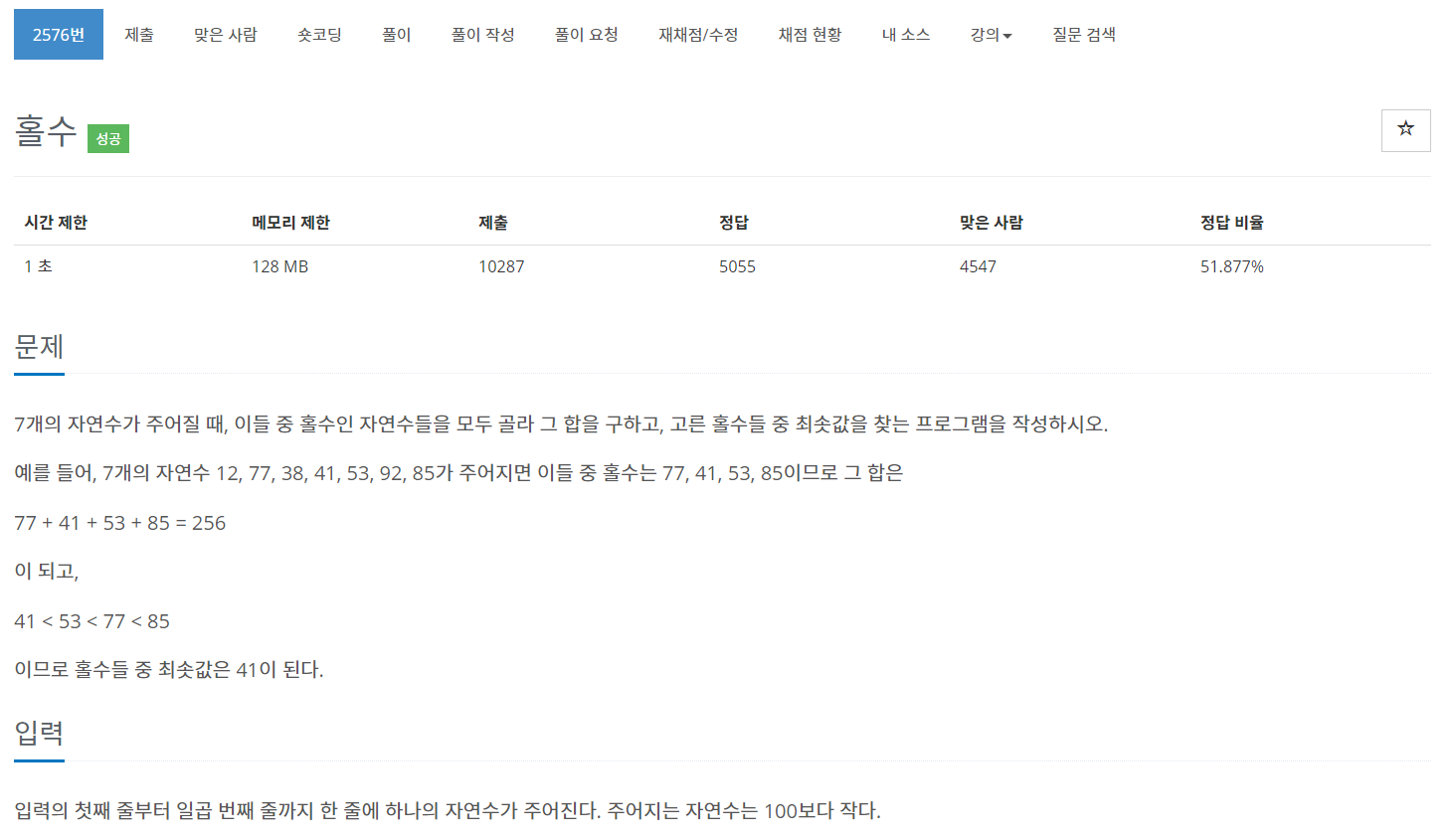 이번에는 BOJ의 2576번 문제 "홀수" 를 풀어보도록 하자
