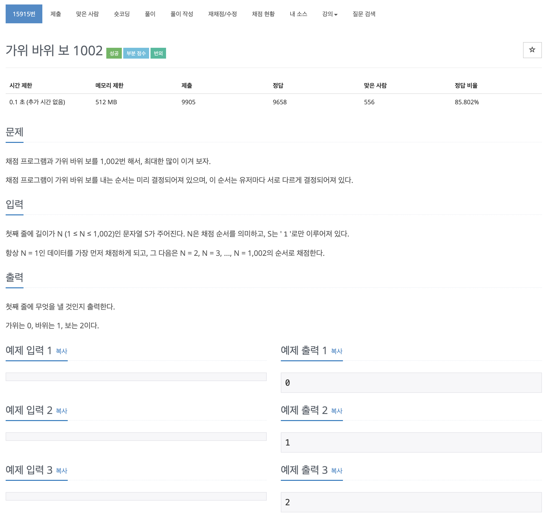 이번에는 BOJ의 15915번 문제 "가위 바위 보 1002" 를 풀어보도록 하자