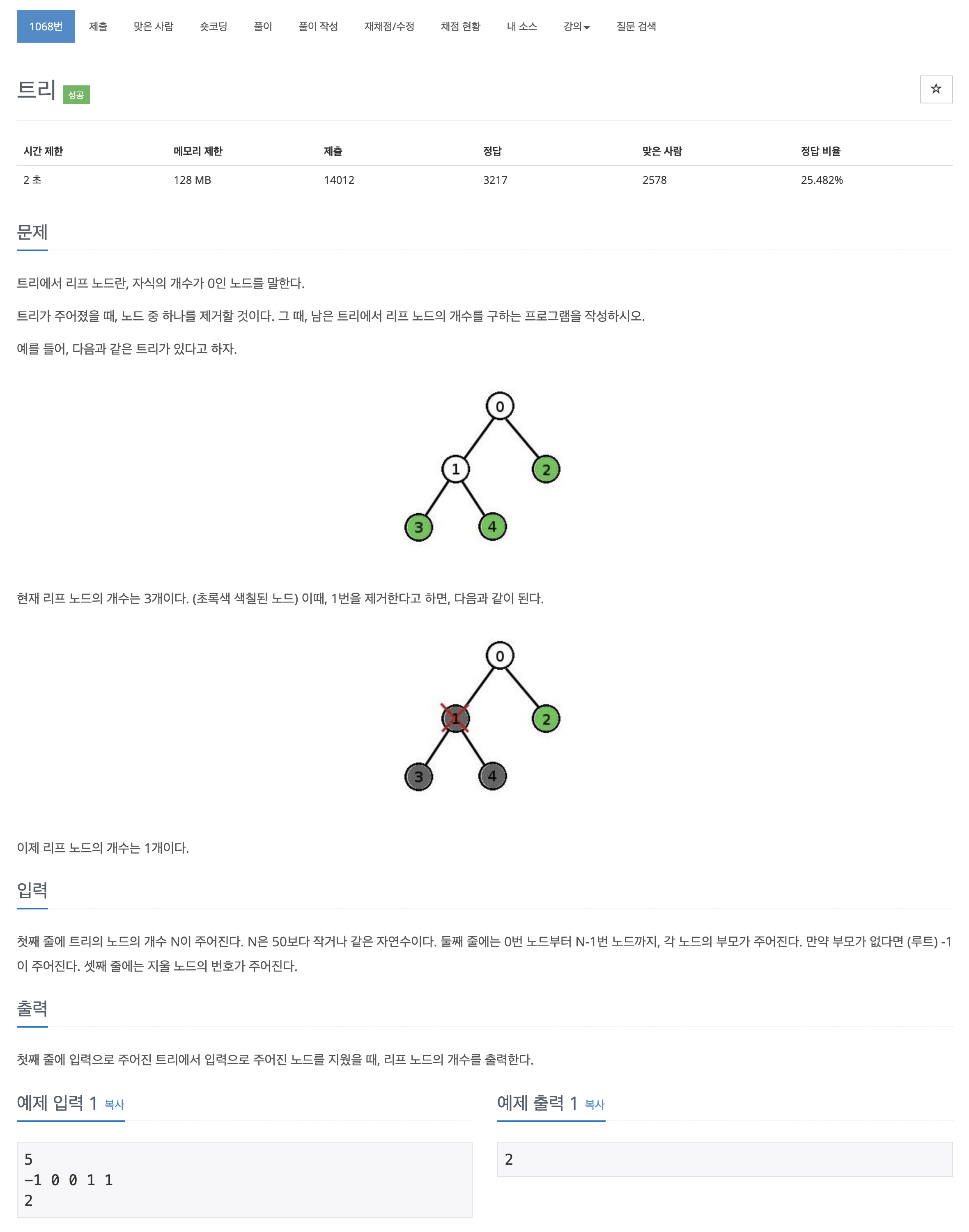 이번에는 BOJ의 1068번 문제 "트리" 를 풀어보도록 하자