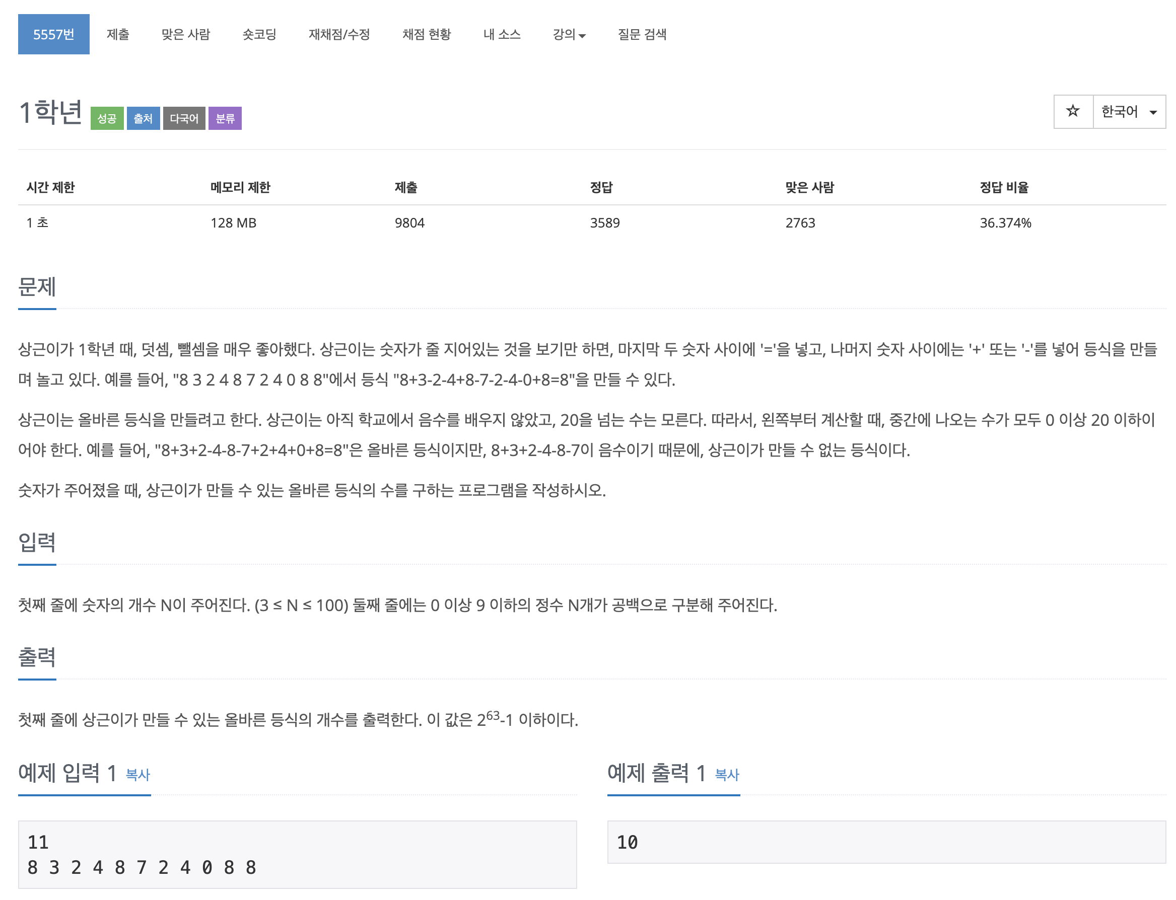 이번에는 BOJ의 5557번 문제 "1학년" 을 풀어보도록 하자