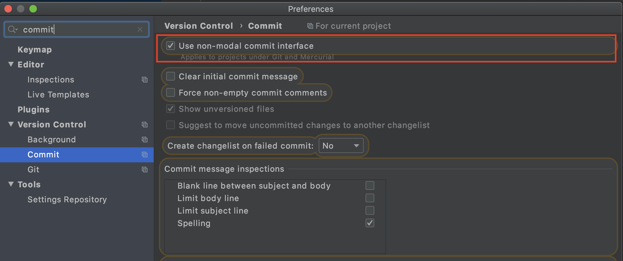다시 Use non-modal commit interface 를 체크하면 깃탭은 그대로 살아있고, 커밋다이얼로그만 페이지 내에 뜨도록 변경되는 거 보니.