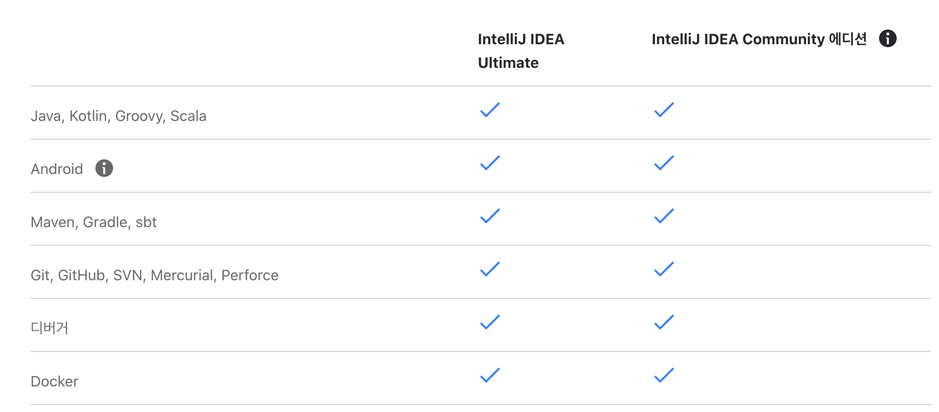 Ultimate 쪽이 HTTP 클라이언트, JavaScript, TypeScript, HTML, CSS, Node.js, Angular, React, Vue.js, 데이터 베이스 도구, SQL, Kubernetes 등 더 다양한 기능을 제공하고 있지만, Community 만으로도 Java, Kotlin 등 대략적인건 사용가능하니깐 Community 버전으로 받아보도록 하자~!👌