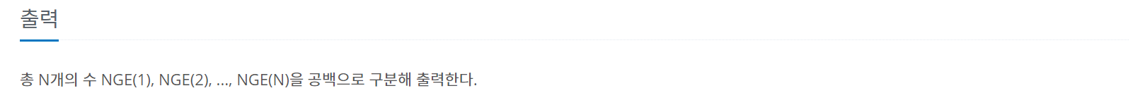 일단 크기가 N인 수열 A 를 입력으로 받고 각 원소 Ai 에 대해서 오른쪽에 있으면서 해당 원소보다 큰 가장 왼쪽에 있는 수를 출력하는 문제이다. 문제자체는 간단한데, 시간제한은 1초로 짧고, 입력으로 주어지는 수열A의 크기가 1,000,000(백만) 으로 꽤나 크다는 것을 알 수 있다. 즉, 그냥 루프로 돌려버리면 안된다는 것이다.
