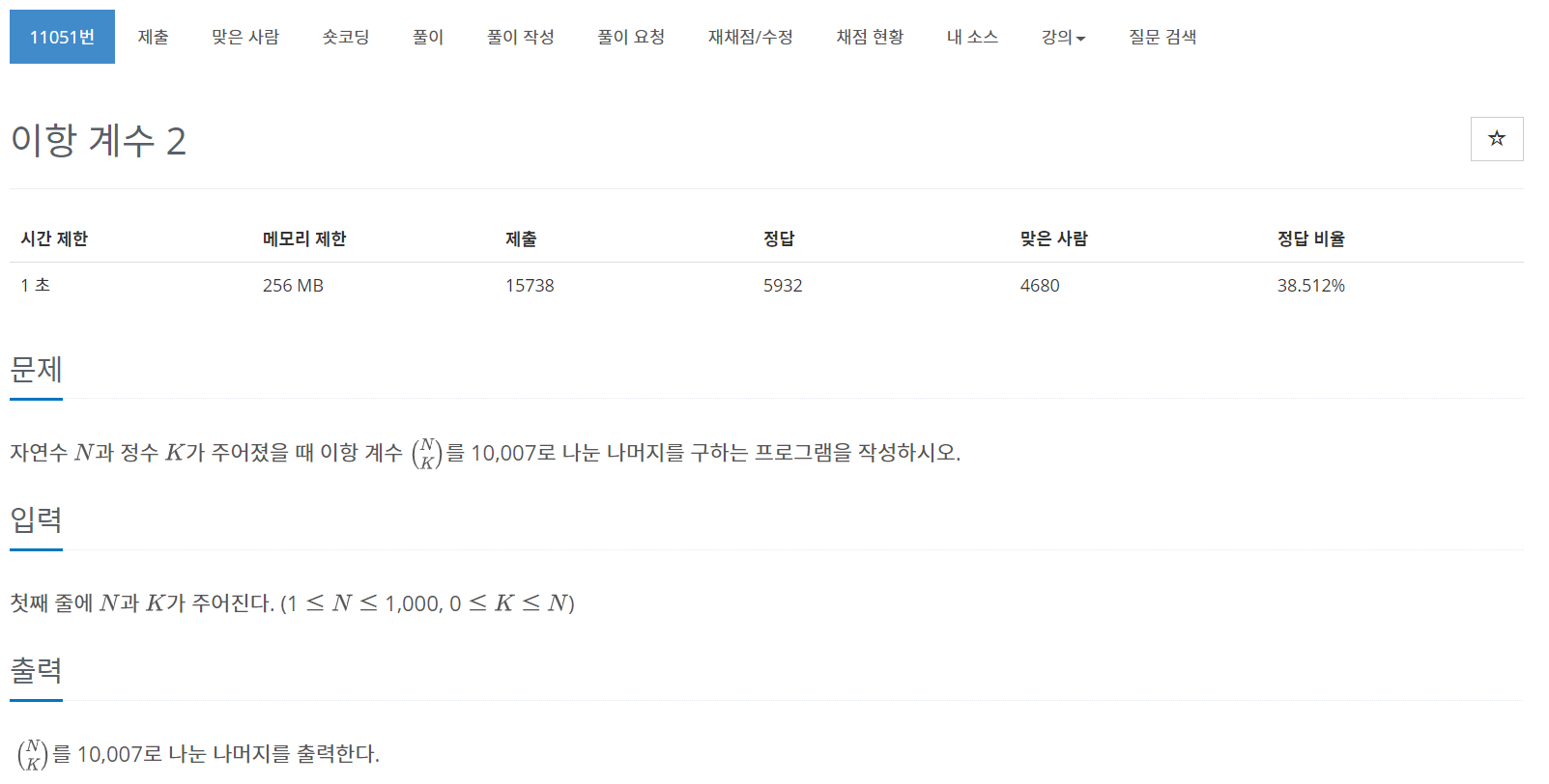 입력으로 N과 K가 주어지고 주어진 입력을 통해, 이항계수 (N K) 를 10,007로 나눈 나머지를 구하는 프로그램을 작성하는 문제이다. 문제는 간단하니, 부가설명없이 성공한 코드는 아래와 같다.