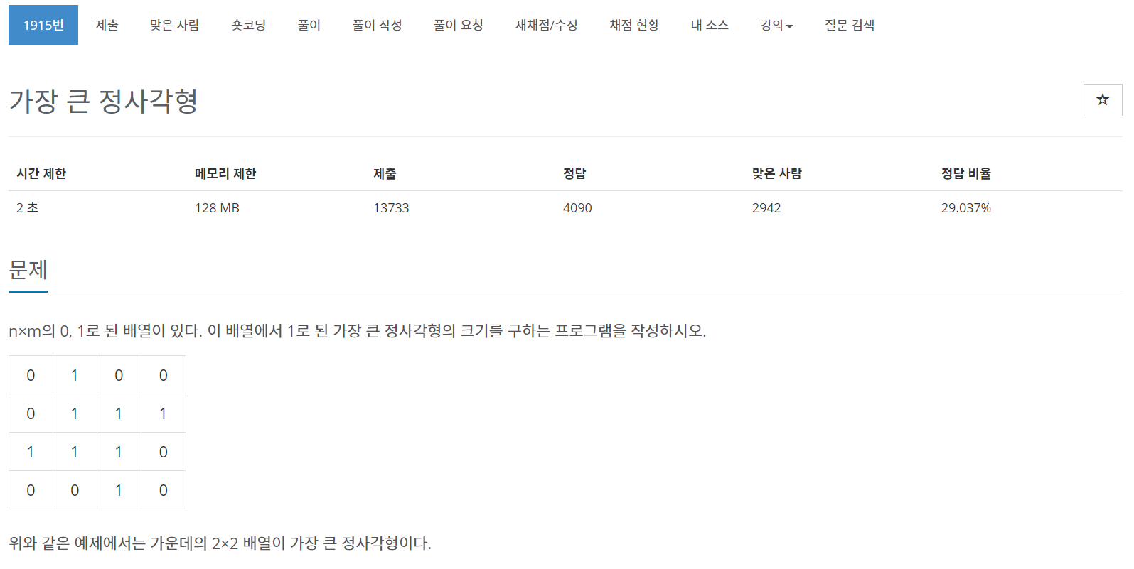 이번에는 BOJ의 1915번 문제 "가장 큰 정사각형"을 풀어보도록 하자