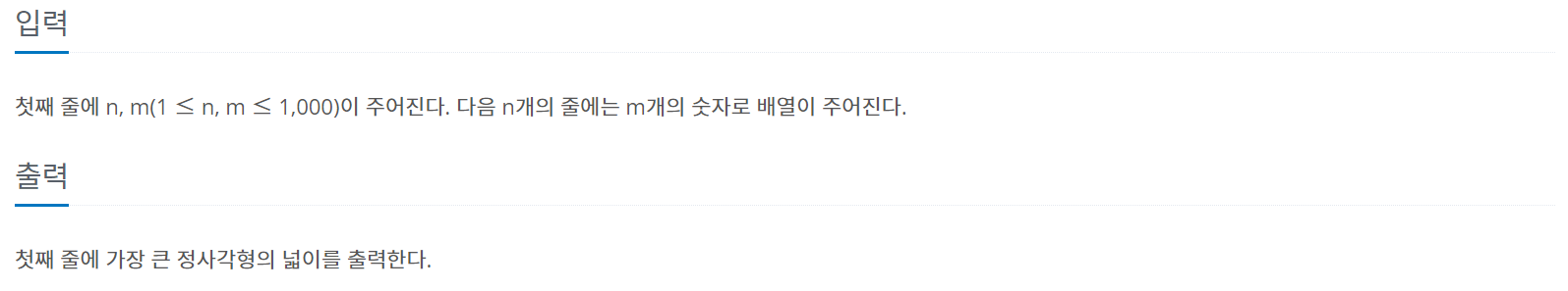다이나믹 프로그래밍으로 풀면 간단하게 풀리는 문제이다. 입력으로 먼저 n, m 주어지고, 그 다음 n개의 줄에 m개 만큼 "0"이나 "1"이 주어진다. 이것을 이용해서, 1로 이루어져 있는 가장 큰 정사각형의 넓이를 구하면 되는 문제이다. 예제를 보면