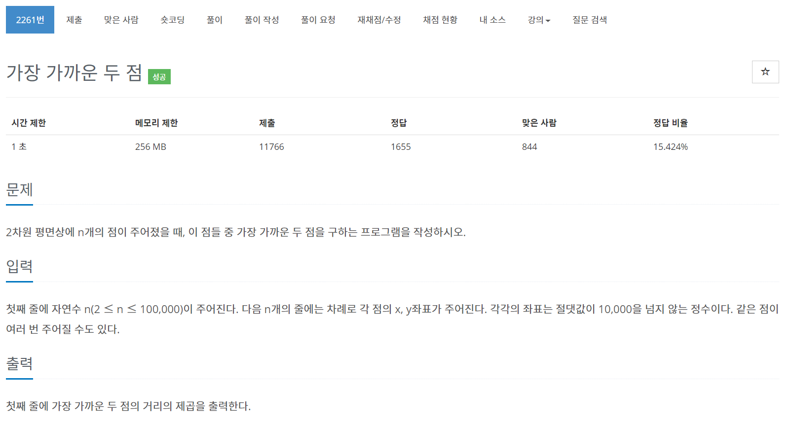 이번에는 BOJ의 2261번 문제 "가장 가까운 두 점" 문제를 풀어보도록 하자