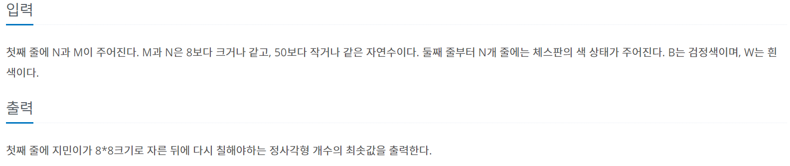먼저 문제설명을 해보자면, 지민친구가 8 * 8 크기의 체스판을 만들려고 하는데, 주어진 N * M 크기의 보드가 검정 / 흰색 패턴이 번갈아가며 칠해져 있지 않아 따로 칠해줘야 된다. 이 때, 8 * 8크기로 보드를 자른뒤에 다시 칠해야하는 정사각형의 개수의 최솟값을 구하는 프로그램을 구해야 되는 문제이다. 입력으로는 처음에 N과 M이 주어지고, 둘째 줄부터 N개의 줄만큼 체스판의 색상태가 주어진다. (B는 검정색이고, W는 희색이다.) 그리고, 출력으로는 지민이가 다시 칠해야하는 정사각형 개수의 최솟값을 출력하면 되는 문제이다.