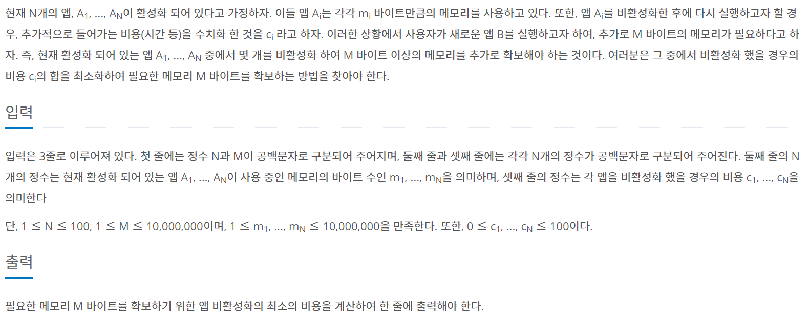 일단, 문제가 매우 길다. 쉽게 설명해 주면 앱에 백그라운드에 사용되어지고 있는 메모리가 있고, 그 메모리를 처리하는데 비용이 드는데, 입력으로 앱의 개수 N이 나오고, 확보하기위한 메모리바이트 수인 M이 주어진다. 그 다음에, 앱의 개수 N개 만큼 사용중인 메모리의 바이트m이 차례대로 주어진다. 그리고, 앱의 개수 N개 만큼 메모리를 확보하기위해 앱을 비활성화 했을 때 드는 비용 c가 차례대로 주어진다. 출력으로는 필요한 메모리 바이트 수인 M을 확보하기 위한 최소의 비용을 구하면 된는 문제이다.